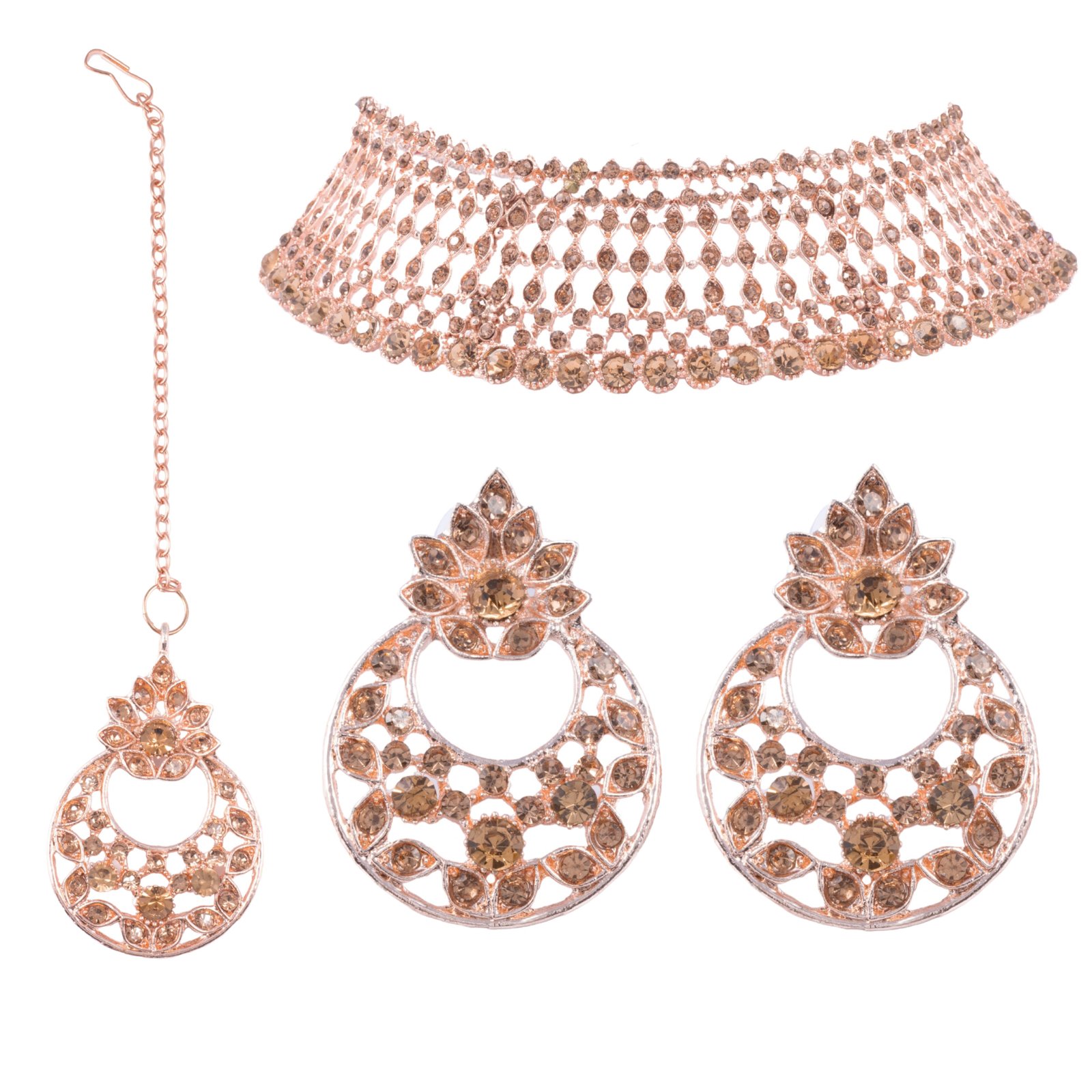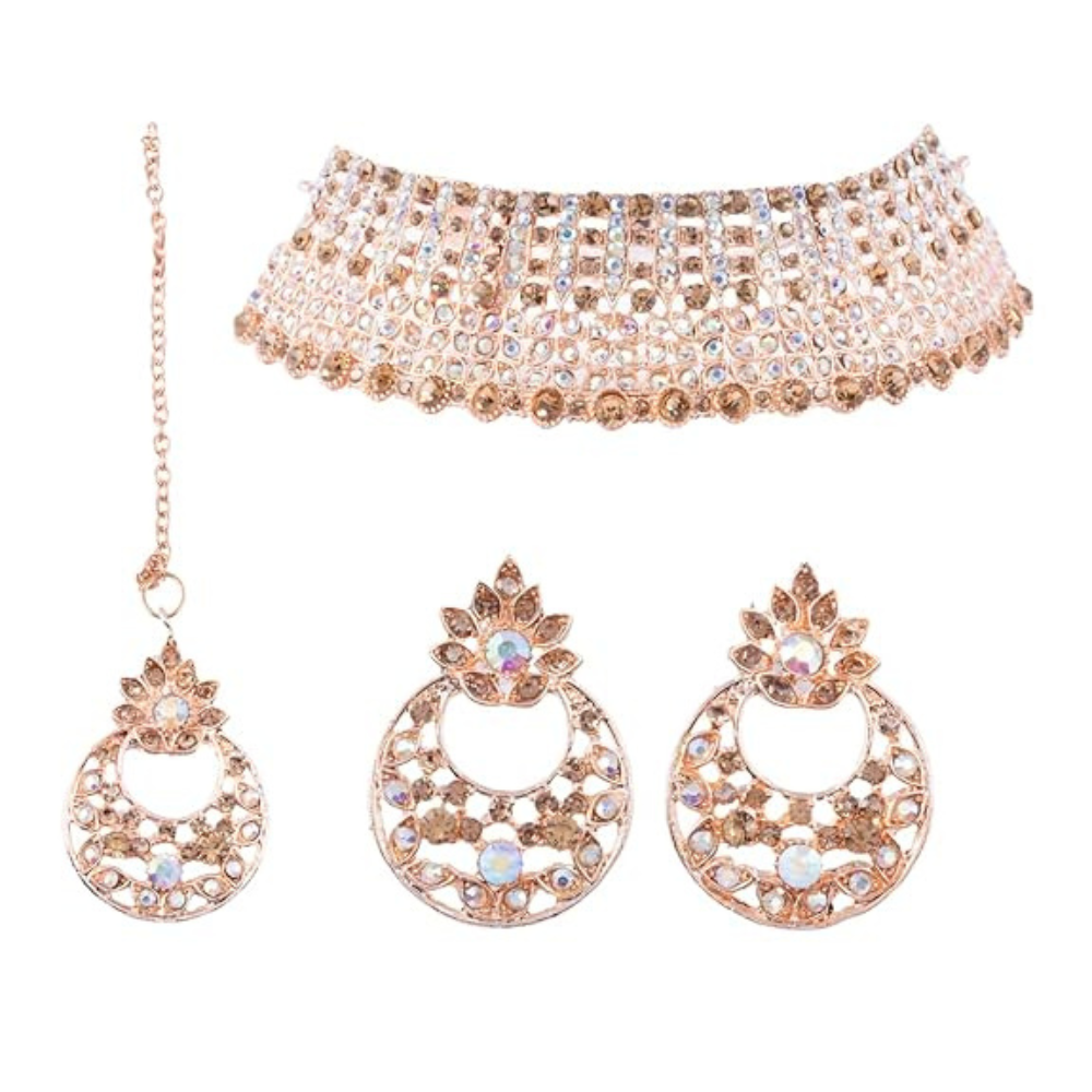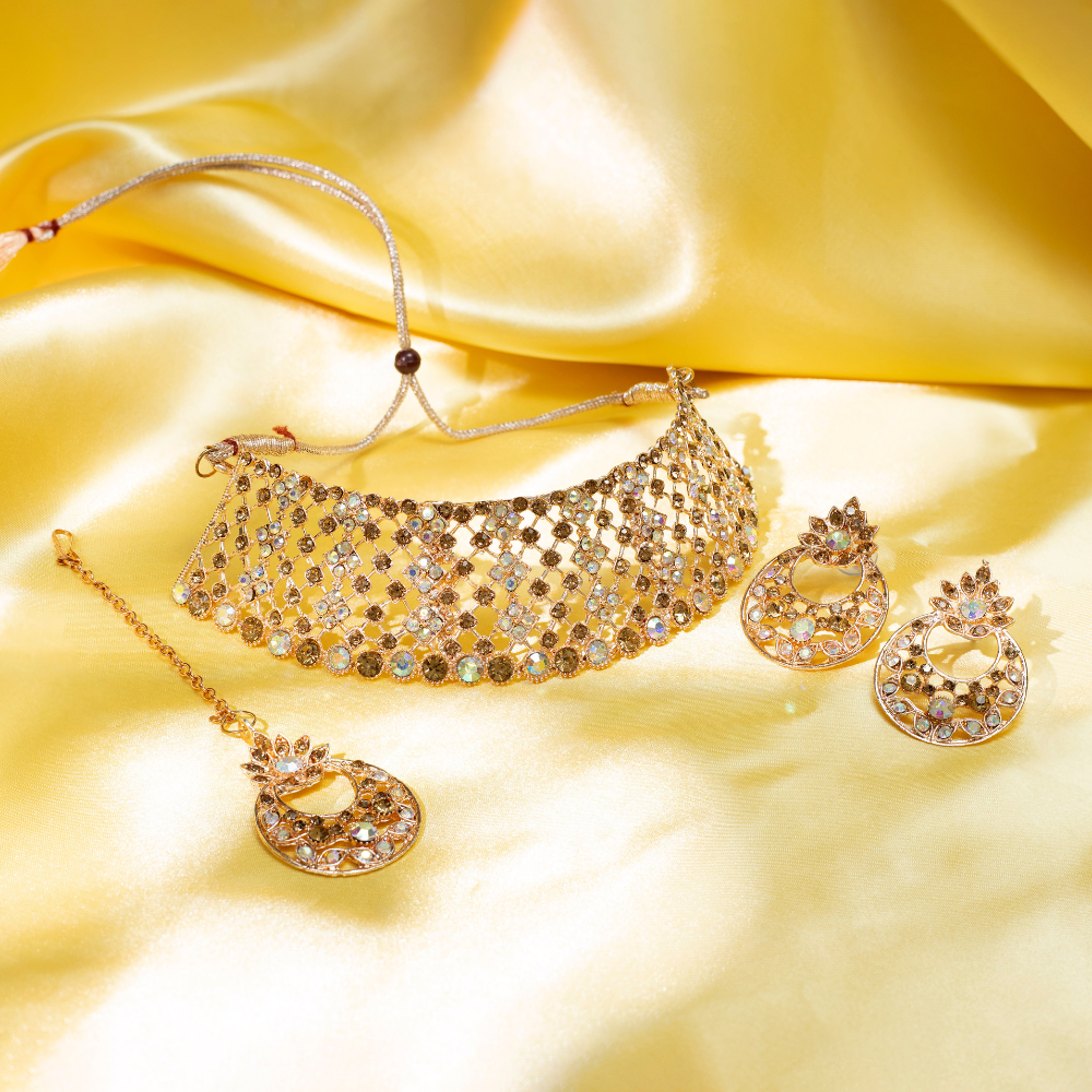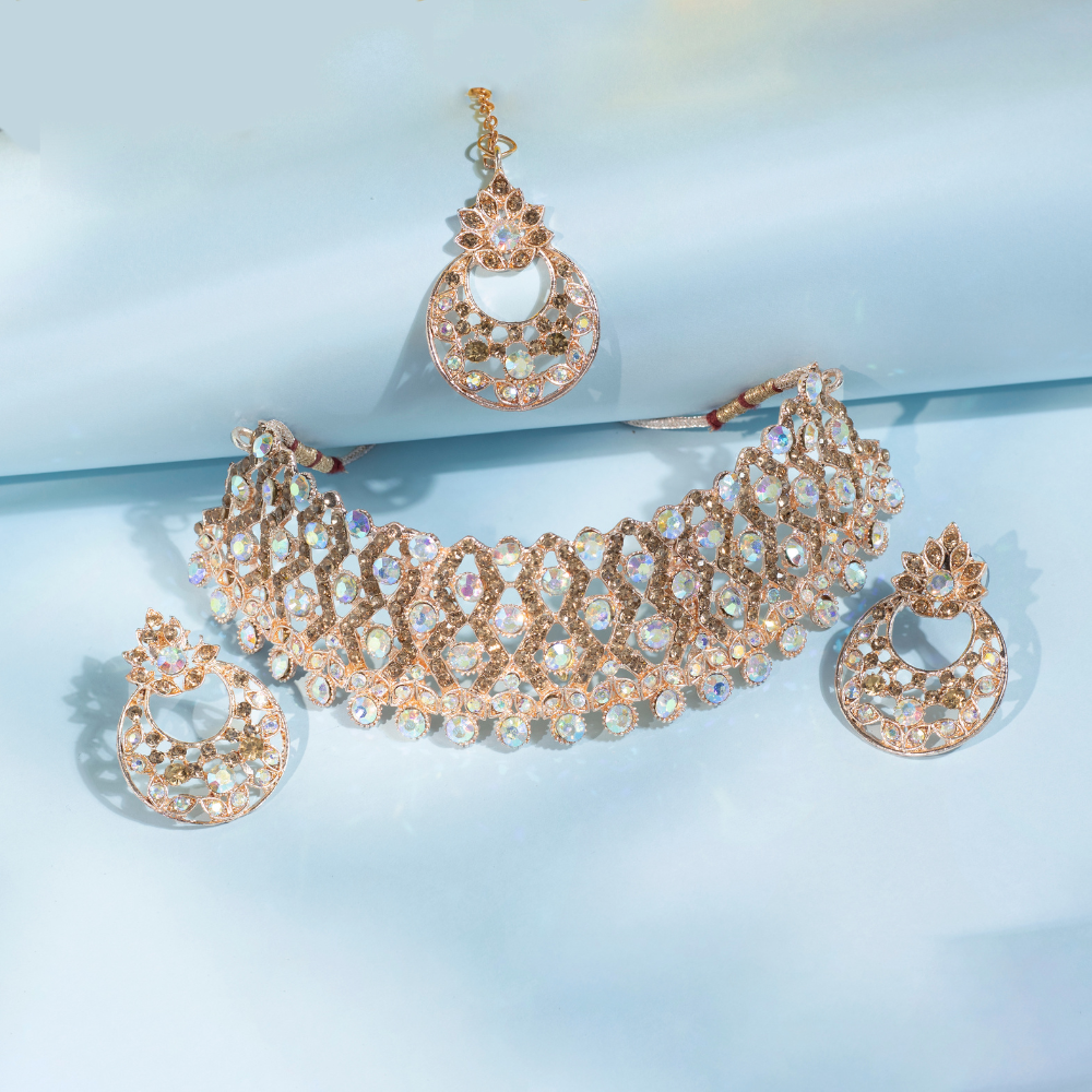 Crystal Glow Choker Necklace Set with Earrings & Maang Tikka